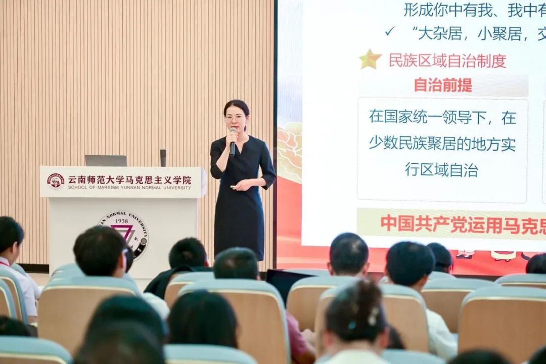 接下来,各学段教师依次进行教学展示。云南师范大学幼儿园徐嘉蔚带着小朋友作了《籽籽同心聚合力 民族团结一家亲》的展示;云南师范大学附属小学刘婷婷展示了小学《道德与法治》四年级下册的相关内容;云南师范大学实验中学李磊祺呈现了初中《道德与法治》九年级上册的教学;云南师范大学附属中学陈晓云讲解了高中《思想政治》(必修三)的内容;云南师范大学马克思主义学院蒋晓涵则展示了本科学段《习近平新时代中国特色社会主义思想概论》的教学。各学段的教学展示充分体现了思政课在不同学段的特点与要求,展现了大中小学思政课要遵循“循序渐进、螺旋上升”的教学理念。