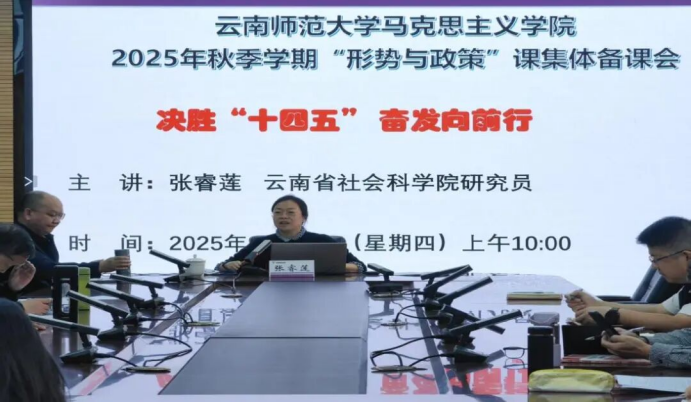 为深入贯彻落实国家关于加强和改进新时代思想政治理论课建设的部署要求,将形势与政策课打造为落实立德树人根本任务、服务国家战略人才培养的核心阵地,9月25日,云南师范大学马克思主义学院在明德4号楼322会议室开展2025年秋季学期“形势与政策”课集体备课会,主题研讨“决胜‘十四五’奋发向前行”。备课会邀请云南省社会科学院研究员,云南大学硕士生导师,云南省委云岭先锋讲师团、铸牢中华民族共同体意识宣讲团、省直机关讲师团成员张睿莲研究员主讲,“形势与政策”教研室全体教师参加。备课会由教研室主任兰青松主持。