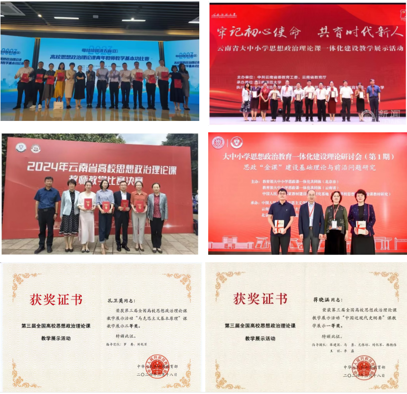 夯实教学根基,思政“金课”建设稳步提升。严格对标教育部要求,完善思政课“金课”建设标准。开足开好“习近平新时代中国特色社会主义思想概论”等核心课程,将铸牢中华民族共同体意识教育全面融入思政课教学。创新整合网络优质资源,推进思政课内涵式发展。着力建强师资队伍,持续选派教师参加国家级、省级培训,邀请清华大学、中国社科院等机构专家参与指导。常态化开展集体备课与教学评估,构建“备课-教学-实践-反思-提升”的闭环体系,促进教学能力持续提升。坚持守正创新,积极探索教学模式革新。组建“形势与政策”课程“一课多师”大团队,邀请文化名家、优秀校友、大国工匠、模范人物等参与,使课内和课外相互支撑、理论和实践相互印证;“四史”课程创新“思政课+艺术作品”的“双师联讲”,以艺术深化理论感悟。完善“以赛促教”机制,打造“一站式”磨课流程,组建名师指导专家库。积极构建“大思政课”格局,拓展育人场域。与西南联大博物馆等10余家单位签约建立实践基地,实现实践育人全覆盖。思政课改革示范效应显著。获省级教学成果奖一等奖1项、校级奖4项;“原理”“德法”课建成校级线上线下混合式、社会实践一流课程,4个教学案例获评省级优秀教案,多门课程启动知识图谱建设,以数字化提升教学互动与实效。2个实践基地入选教育部“大思政课”实践基地,2个项目入选高校思想政治工作质量提升综合改革与精品建设项目。教师获全国高校思政课教学展示一等奖1项、二等奖1项。积极探索大中小学思政课一体化理论与实践的创新发展,获批教育部“大中小学思政课一体化共同体建设”云南牵头单位。