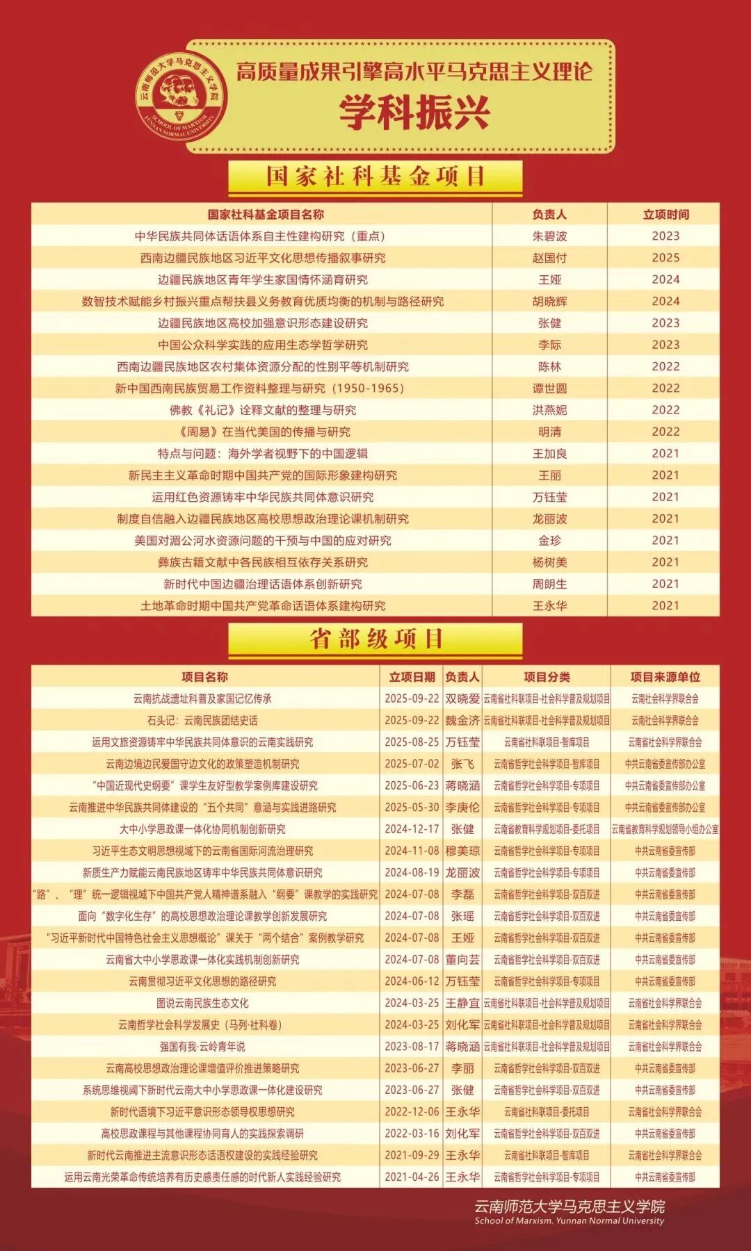 立足马克思主义理论一级学科主体定位,持续优化学科发展格局,推动学科交叉融合取得新突破。构建以“学科带头人+骨干教师+后备人才”为支撑的梯队化学科队伍,依托跨学科研究平台与项目,主动对接哲学、历史学、政治学、民族学等相关学科,实现深度交叉融合。聚焦“中国式现代化”等重大理论与实践命题,组建跨学科联合攻关团队,逐步形成“马克思主义与生态文明”“党史党建与基层治理”等一批特色研究方向,学科辨识度与影响力不断提升。