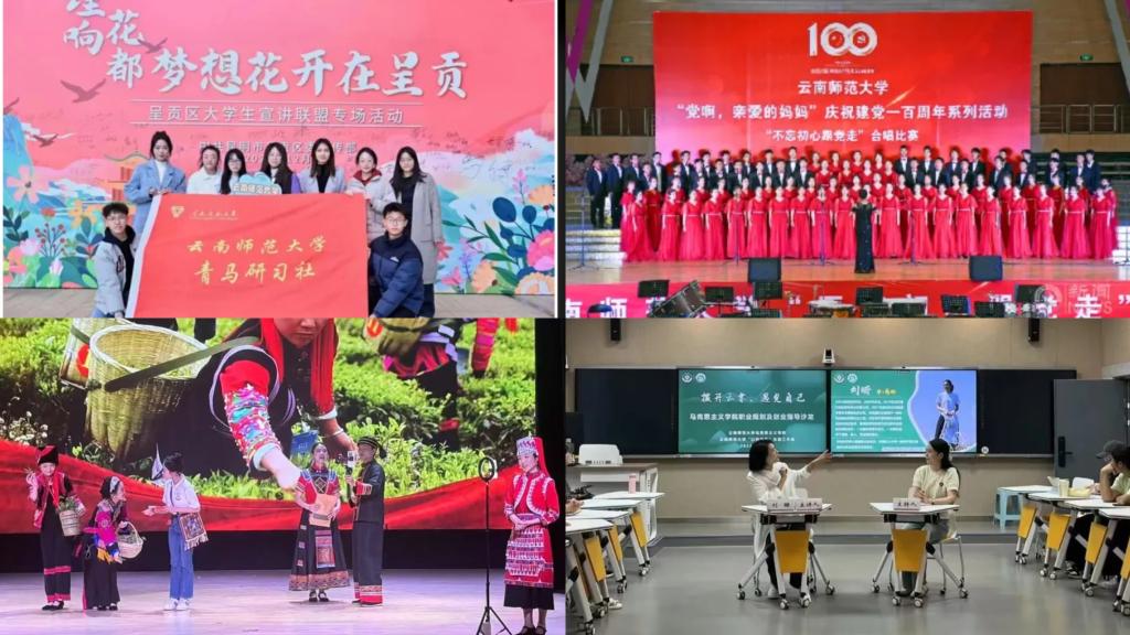 学院聚焦阵地升级与育人实效,构建多元协同育人阵地体系,强化思政教育质效。物理阵地扩容提质,以“一站式”学生社区建设为核心,深化党建引领与文化美育,设立“党员示范寝室”,拓展自习室、活动区等功能空间,通过“星级寝室”评比推进文明寝室建设。打造具有学院特色的清廉文化长廊,串联校史廉洁资源、红色革命故事与中华廉洁美德,推动清廉理念入脑入心;数字阵地精准赋能,以微信公众号为宣传主阵地,开设“西南联大爱国主义云端思政课”“行走的思政课”等品牌栏目,整合理论学习、活动预告、榜样展示、反诈宣传等内容,让数字阵地成为联系引领青年的重要纽带;特色阵地深耕细作,擦亮“青马研习社”宣讲品牌,以“青春故事分享课”“云师青年说”等活动宣讲党的创新理论,累计开展宣讲300余场,覆盖5万余人次,团队事迹获人民网等主流媒体报道;实践阵地延伸拓展,整合校内外资源,每年组建师生团队开展返家乡、进社区等10余种主题社会实践活动,先后多次赴德宏州梁河县芒东镇开展“传承红色基因·助力乡村振兴”实践活动,完善“校地融合、双向赋能”育人新模式,推动实践阵地从基层服务向红色浸润、服务赋能拓展。各类阵地协同发力,以阵地拓新打破思政教育边界,为人才培养搭建起全方位、立体化育人新场域。