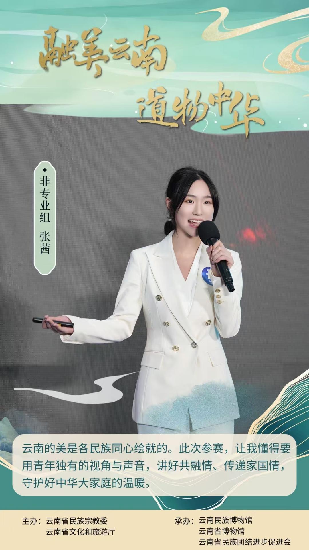 11月7日,由云南省民族宗教事务委员会、省文化和旅游厅联合主办,云南民族博物馆、云南省博物馆、云南省民族团结进步促进会共同承办的“融美云南 道物中华”铸牢中华民族共同体意识讲解邀请赛决赛在云南民族博物馆圆满落幕。我院研究生张茜凭借扎实的理论素养与出色的现场表现,斩获非专业组第三名。