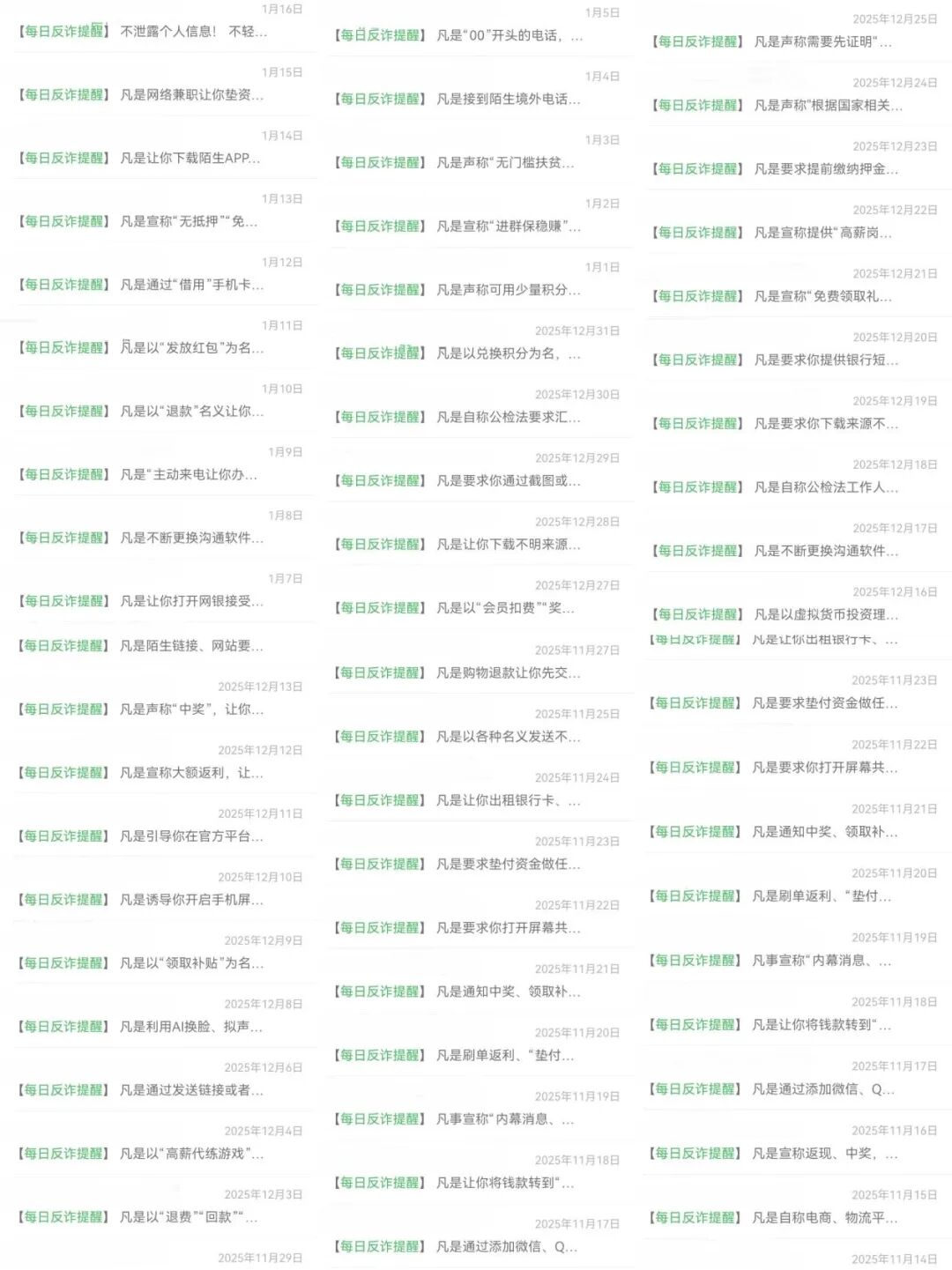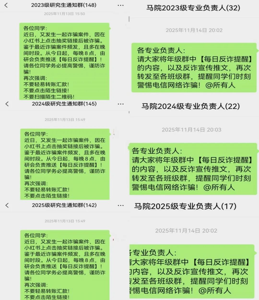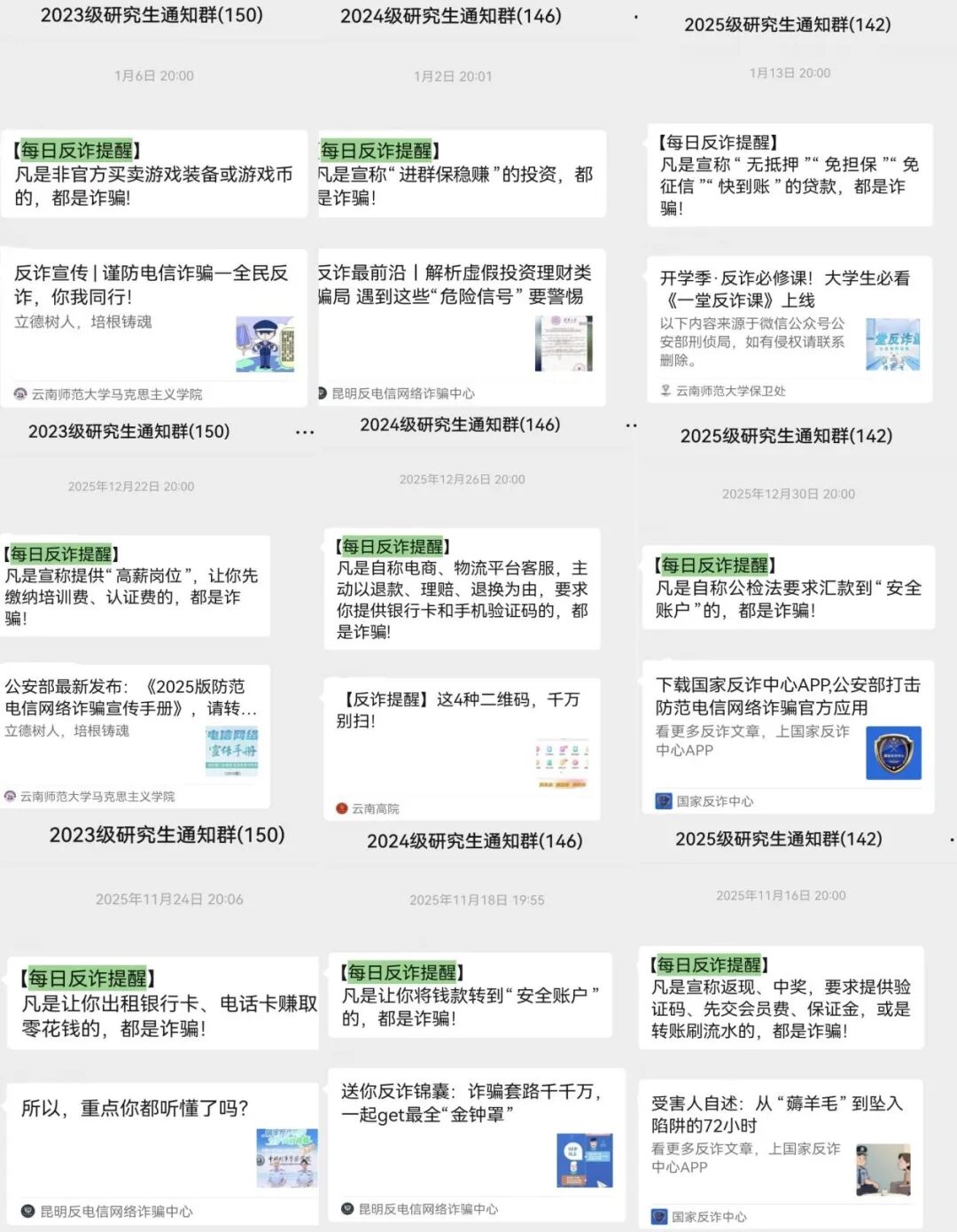 为切实守护研究生财产安全,提高学生反诈意识与识诈能力。2025年11月至2026年1月,马克思主义学院(中共党史党建学院)依托研究生会,针对诈骗案件高发时段,于每晚八点准时推送“每日反诈提醒”及各类型反诈推文,全覆盖、常态化、精准化持续推进研究生反诈宣传教育工作,构建起“学院—年级—专业—班级”四级宣传矩阵。